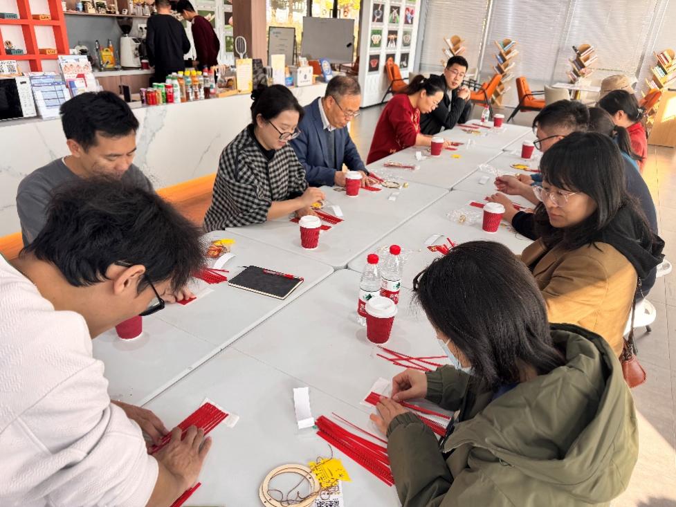座谈意犹未尽,一场别开生面的“爱我中华”红色主题手工活动随即展开。在手工老师的指导下,参与者们投入到了红色元素手工制品的创作中,先是有条不紊地进行竹编,随后剪出一个圆形,贴好形成一个完整的吊牌,随后用绳子串上风铃,再精心拼贴制作天安门、党徽等图案,最后形成一个完整的装饰风铃。一剪一贴,一笔一画,传递的是对革命先辈的敬意;一拼一接,一缝一纫,凝聚的是对伟大祖国的深情。在亲手实践中,抽象的爱国爱党情怀变得可触可感,捧着共同完成的作品,大家脸上洋溢着自豪与喜悦。