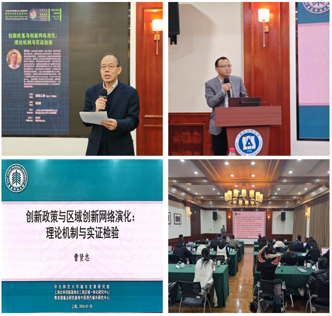 第一部分为学术专题讲座。曹贤忠教授作题为《创新政策与创新网络演化:理论机制与实证检验》的专题报告,从理论与实证两个层面展开报告。在理论部分,曹贤忠教授立足国际前沿研究与中国政策实践,系统梳理了政策视角下创新网络研究的发展脉络,指出创新政策已成为塑造区域创新合作网络的重要因素。他基于新区域主义视角,构建了创新政策影响创新网络演化的分析框架,强调政策可通过目标设定、政策工具、政策主体与政策环境等维度的协同作用,从而对创新网络结构及其效率产生双重影响。